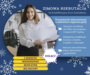 Kurs skierowany jest do osób dorosłych, które chcą zdobyć nowe kwalifikacje zawodowe w obszarze administracji, biurowości i dokumentacji. Uczestnicy nauczą się m.in. sporządzania pism, prowadzenia ewidencji kadrowej i finansowej, obsługi dokumentów oraz organizacji pracy jednostki.